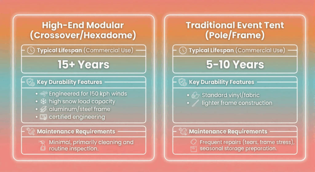 | Tent Type | Typical Lifespan (Commercial Use) | Key Durability Features | Maintenance Requirements |