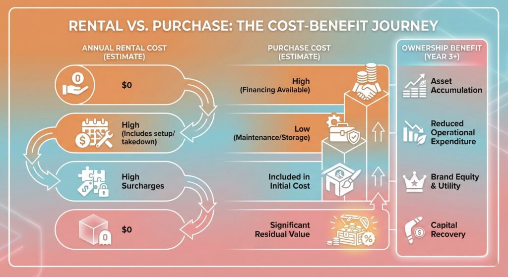 • Hidden Rental Costs: Rental agreements often include mandatory setup, teardown, and transportation fees that accumulate rapidly over multiple years.